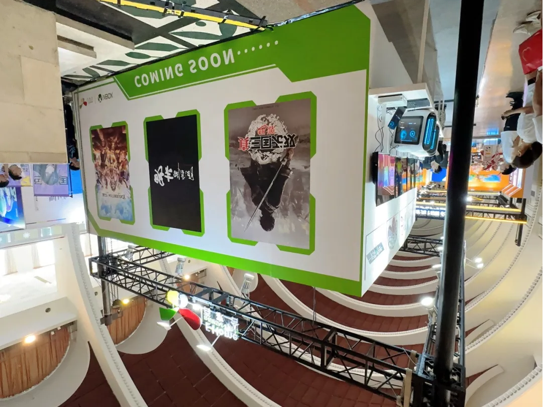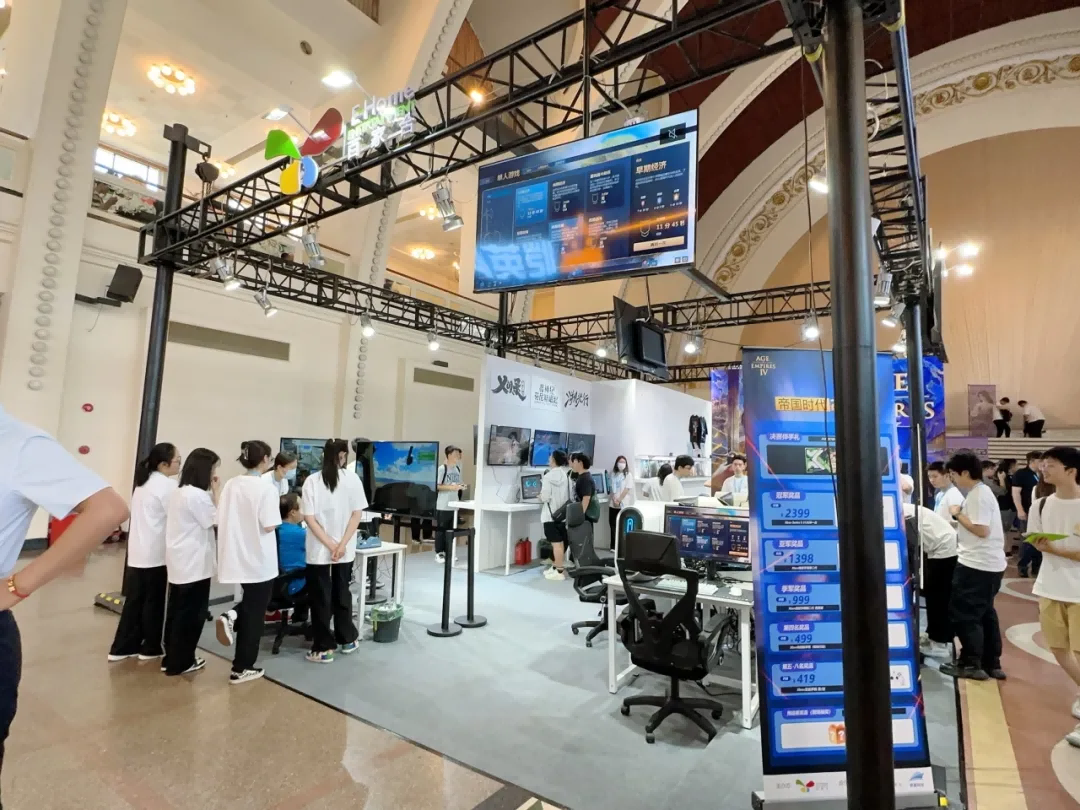 百家合整个展台以直线排列,将展示区域、体验区和咨询区依次划分。这种布局简洁明了,参观者可以沿着直线流畅地参观。体验区放置多台直线排列的电脑供玩家试玩游戏。