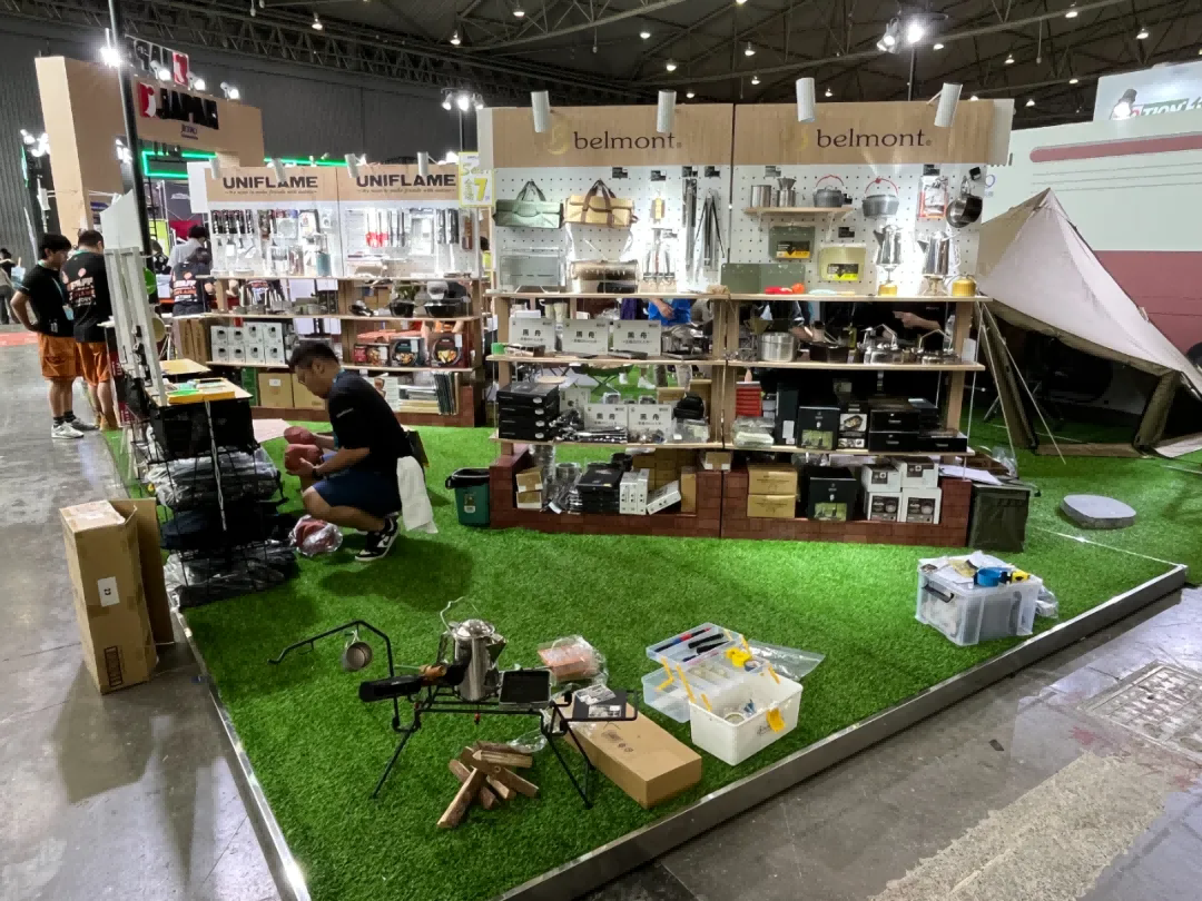 产品展示区精心布置各品牌的户外露营装备,如帐篷、睡袋、炉具等。使用高低错落的展示架,增加层次感,同时方便观众从不同角度观看产品。